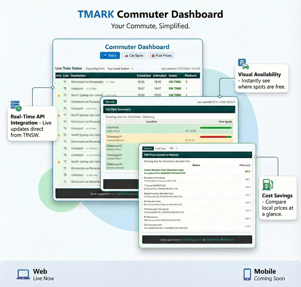 Developed by TMARK Techs as a non-profit community initiative, the Commuter Dashboard is designed to simplify daily travel for residents of New South Wales. This intuitive platform consolidates real-time transport status, parking availability, and local fuel pricing into a single interface.